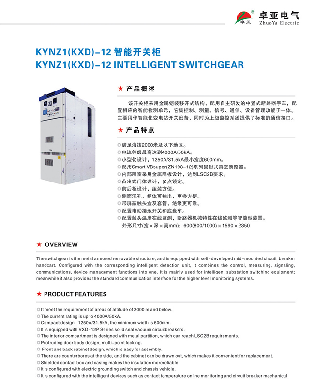 KYNZ1(KXD)-12智能开关柜采用金属铠装移开式结构,配用自主的中置式断路器手车,配置相应的智能检测单元,它集控制、测量、信号、通信、设备管理功能于一体。主要用作智能化变电站开关设备,同时为上级监控系统提供了标准的通信接