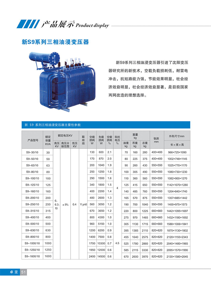 新S9系列三相油浸变压器引进了沈阳变压器所的,空载负载损耗小,耐雷电冲击,抗短路,节能,社会经济效益明显,社会经济效益显著,是目前 两网改造的理想选择。