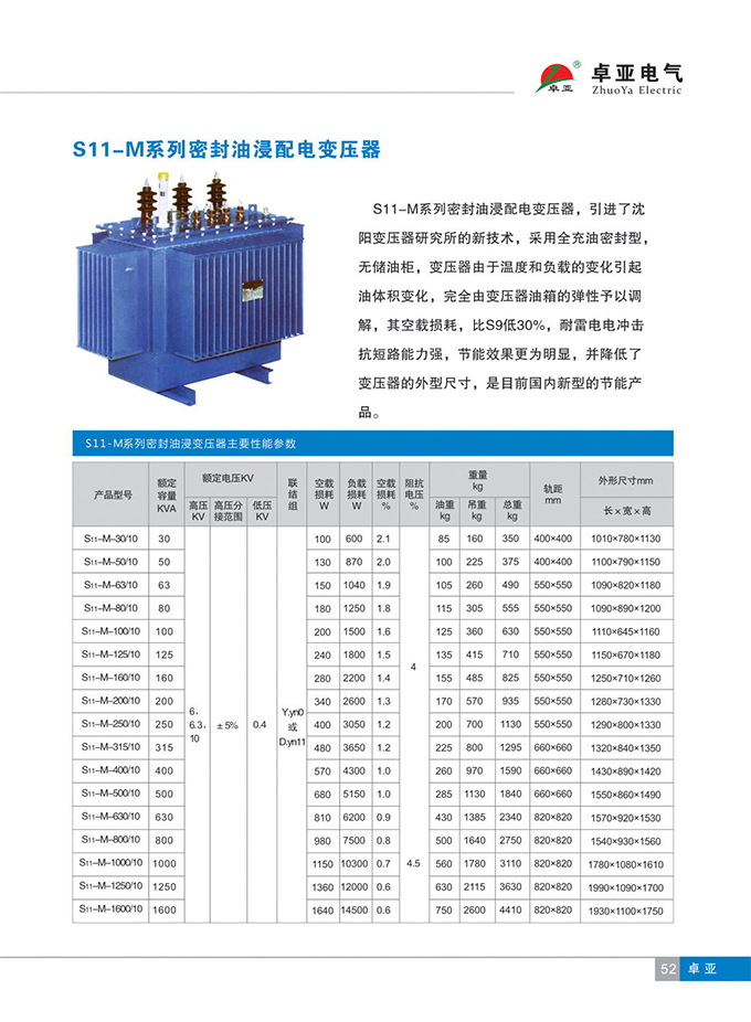 S11-M系列密封油浸配电变压器引进了沈阳变压器所的,采用全充油密封型,无储油柜,变压器由于温度和负载的变化引起油体积变化, 由变压器邮箱的弹性予以调解,其空载损耗,比S9低30%,耐雷电冲击抗短路,节能效果 为明显,并降低了变压器的外形尺寸,是目前国内新型的节能产品。